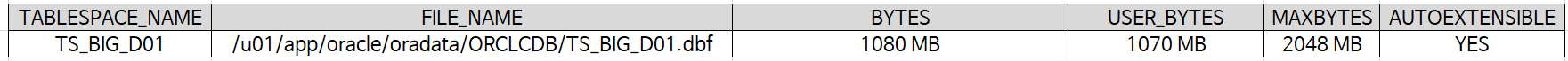 ALTER DATABASE DATAFILE '/u01/app/oracle/oradata/ORCLCDB/TS_BIG_D01.dbf' AUTOEXTEND ON MAXSIZE 2G;