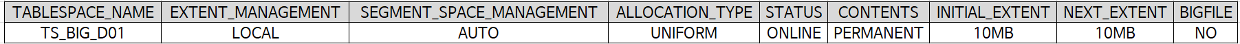 : SQL을 수행하는 접속계정의 DEFAULT TABLESPACE는 TS_BIG_D01