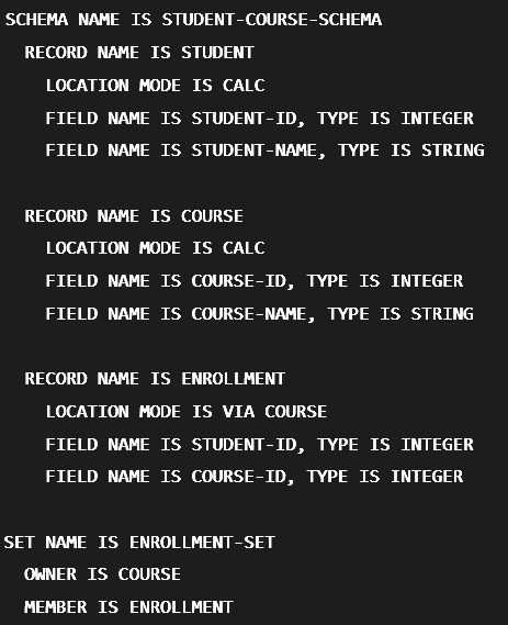 - SET ENROLLMENT-SET는 COURSE를 소유자로, ENROLLMENT를 멤버로 지정하여 학생-과목 간의 다대다 관계를 구현합니다.