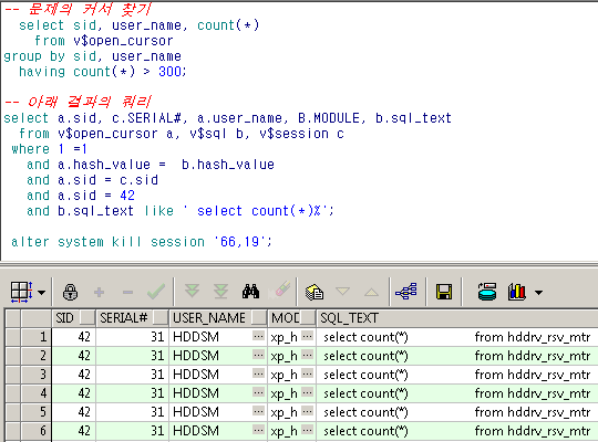 v$Open_cursor View에서 사실을 확인 할 수 있었습니다. 데이터베이스는 사용가능한 Cursor 수가 있으며,