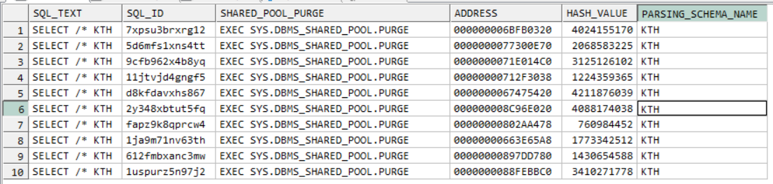 4.1) 위 3.1 SQL 조회 하면 아래와 같이 출력된다. 여기 SHARE_POOL_PURGE 컬럼에 나온 실행문 모두 실행