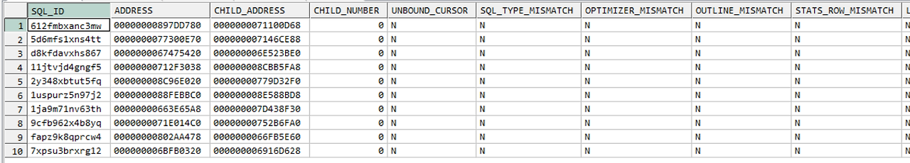 3.2) 위 3.1) 쿼리의 결과인 SQL_ID를 가지고, V$SQL_SHARED_CURSOR 를 조회해보자.