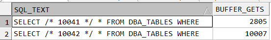 SELECT SQL_TEXT, BUFFER_GETS FROM V$SQL WHERE SQL_TEXT LIKE '%1004%'