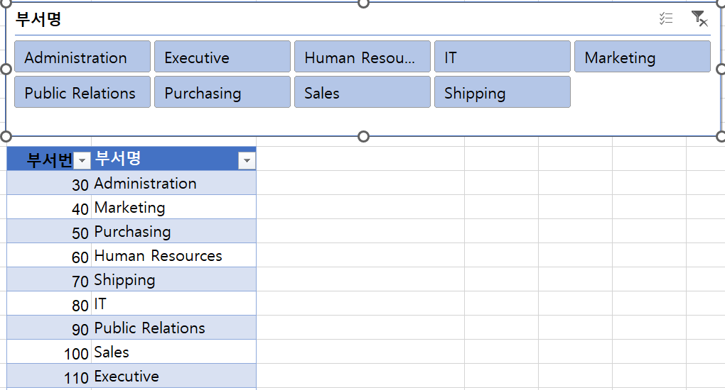 : 데이터 -> Ctrl+A(전체선택) -> Ctrl+T (표만들기) -> 메뉴 테이블 디자인 -> 슬라이서 삽입