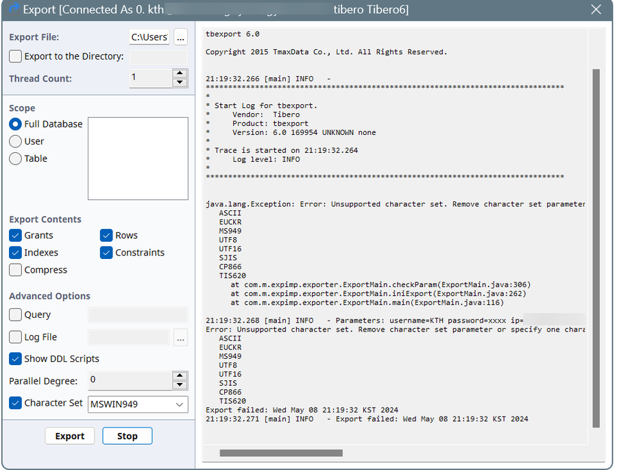 캐릭터셋 "MSWIN949"로 백업을 해놓으려고 한다. 그런데 다음과 같은 에러가 발생한다.