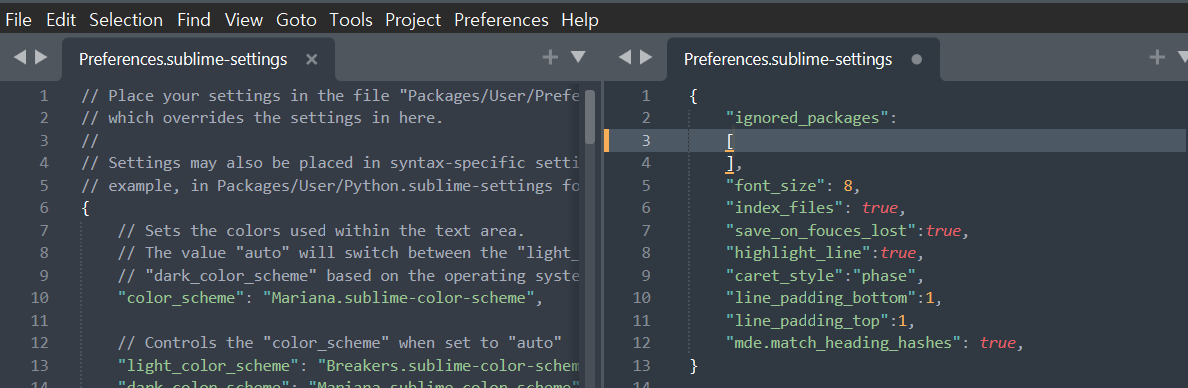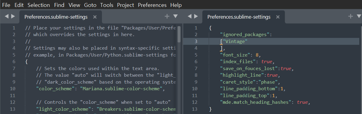 [ 변경 후 ] 우측 "ignored_packages" 영역에 "Vintage" 기입하기, 다시 삭제한다면 활성화됨