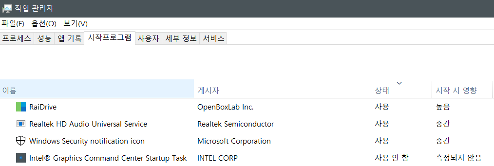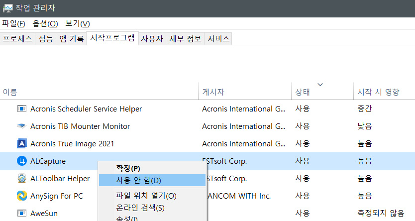 "게시자" 를 확인하여 "사용을 안하는 프로그램" or "광고 의심이 가는 프로그램"은 모두 "사용안함" 처리하면 된다.
