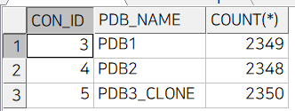 SELECT A.CON_ID , B.PDB_NAME , COUNT(*)