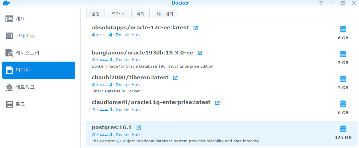 : 다운 된 내역은 이미지 탭에 있다. postgres:16.1 클릭