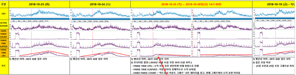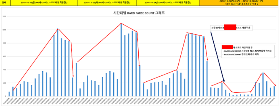 변경한 후 DB "Hard Parse Count"와 "PARSE TIME CPU" 추이 분석한 자료 입니다.