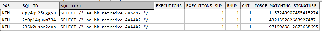 쿼리 결과 건수는 0 이다. 인라인 뷰 안의 SQL만 별도로 수행한 결과 FORCE_MATCHING_SIGNATURE값이 모두 다르기 때문이다. 왜 조회 결과 나오지 않았을까? force_matching_signature는 Literal 값을 바인드 변수화 한 이후에 만든 signature 값인데 왜그럴까?