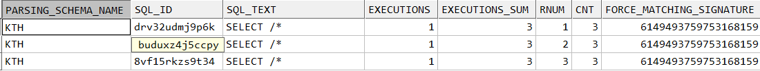 , row_number() over (partition by force_matching_signature order by sql_id desc) rnum