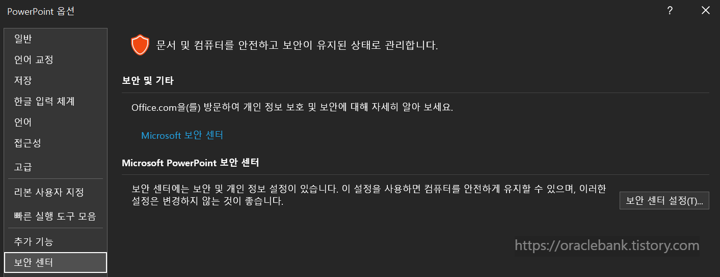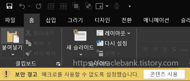 : "[보안 경고] 매크로를 사용 할 수 없도록 설정했습니다." 문구가 나타나지 않는다.