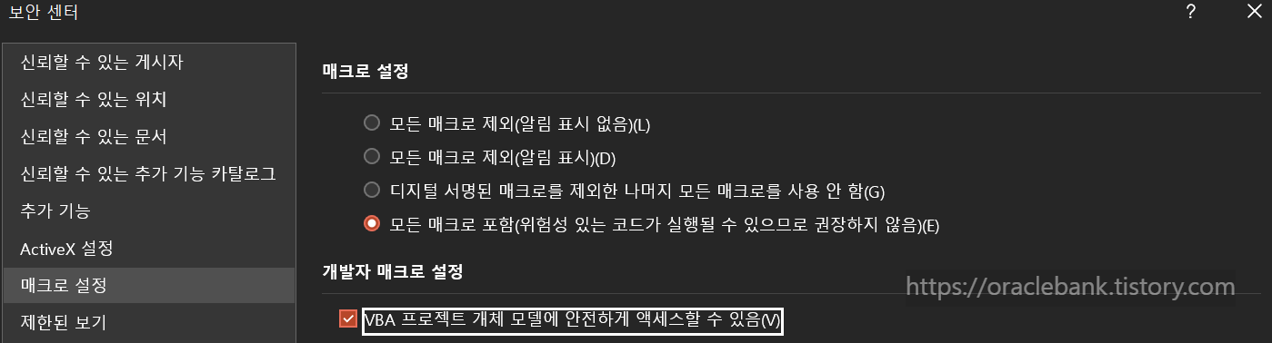 4. 모든 매크로 포함 라디오 버튼 클릭 > VBA 프로젝트 개체모델에 안전하게 액세스할수 있음 클릭