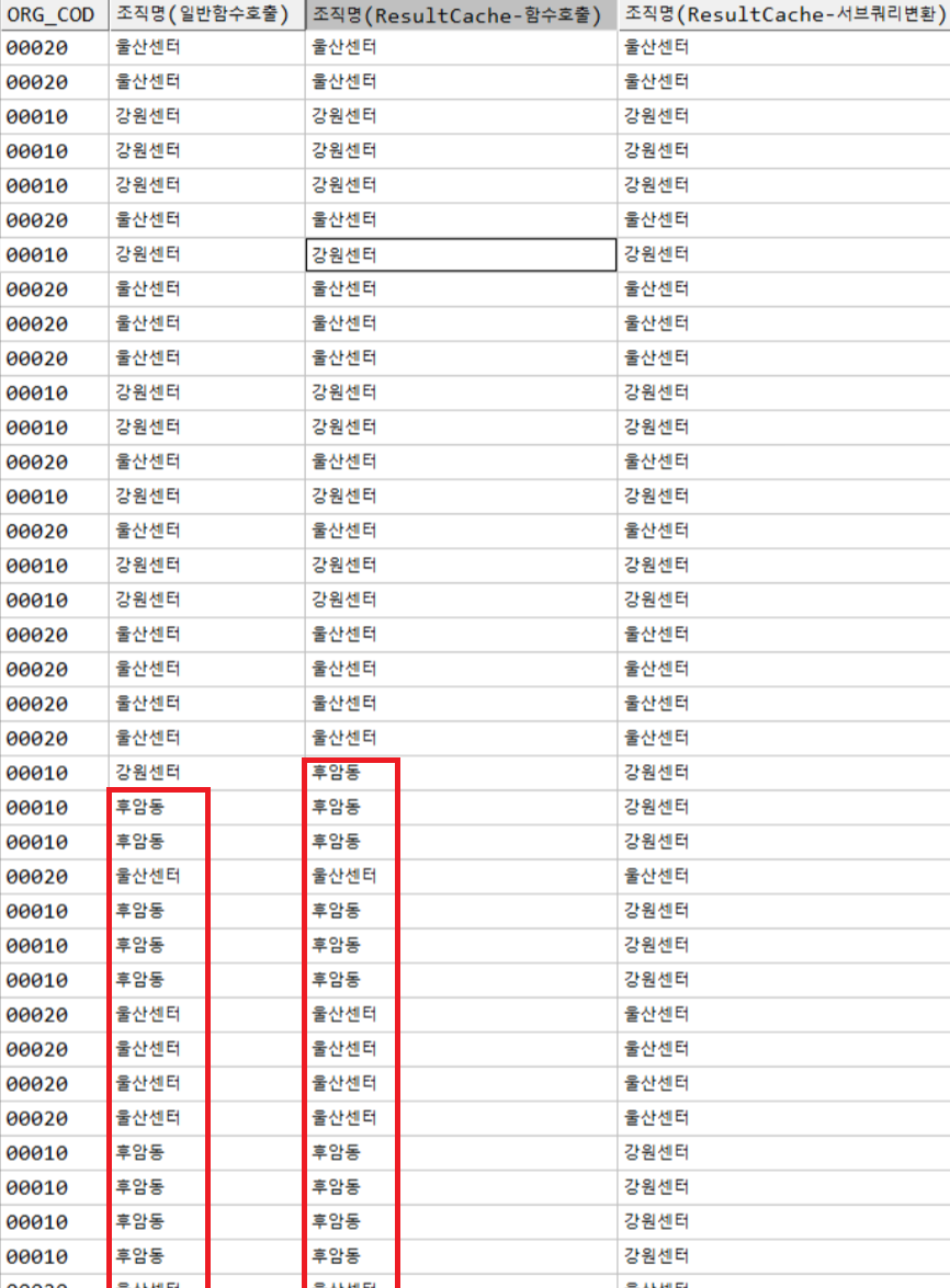 , FN_GET_ORG_NAM_RC( ORG_COD ) AS "조직명(ResultCache-함수호출)"