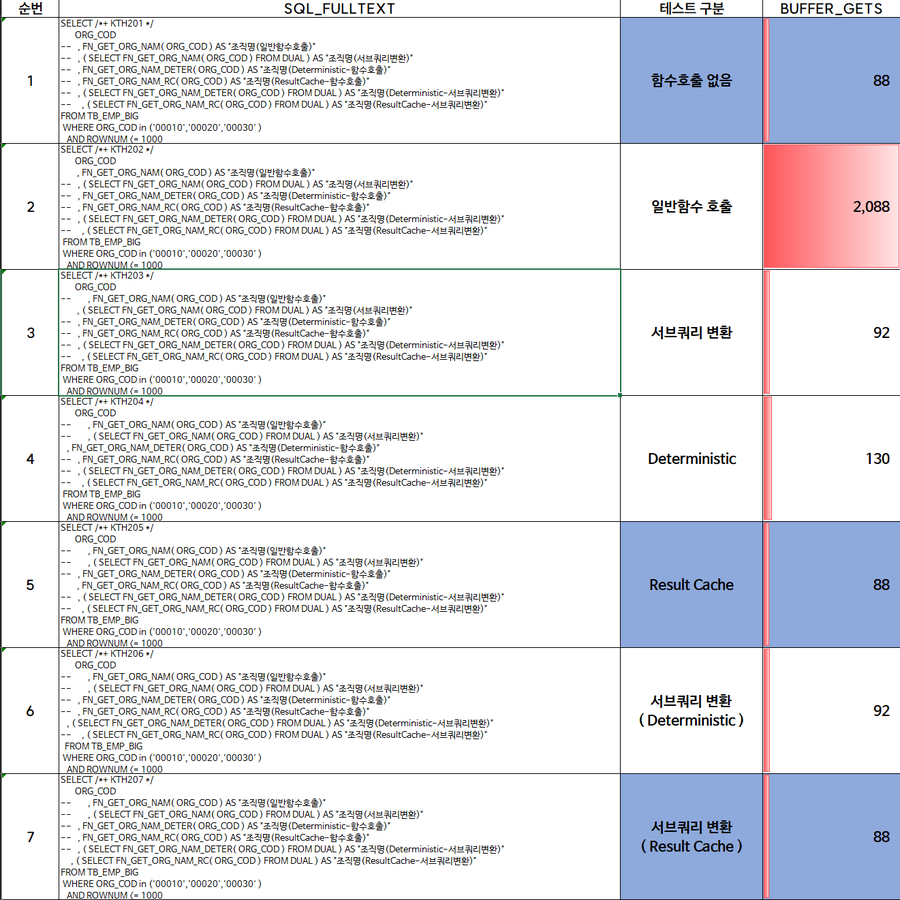 1) 88 Block = 함수호출 없음 = Result Cache = Result Cache + 서브쿼리