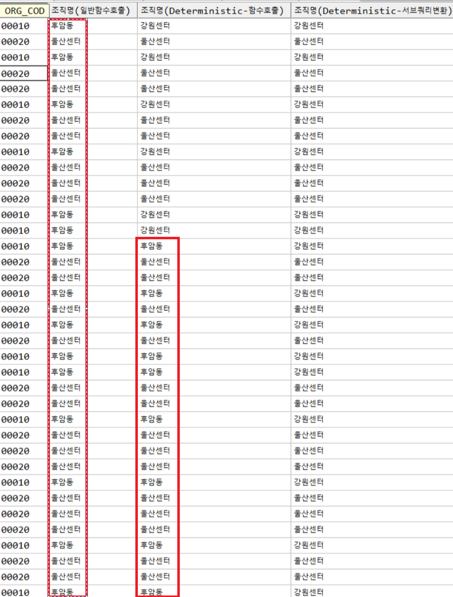 , FN_GET_ORG_NAM_DETER( ORG_COD ) AS "조직명(Deterministic-함수호출)"
